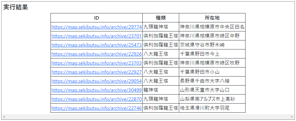 表形式による表示結果
